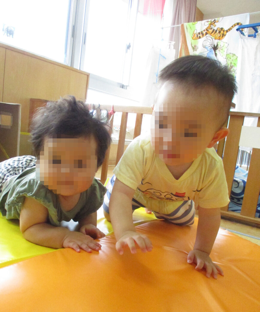 押したり引っ張ったりつかんだり。手指の発達を促す手作りの玩具が、あちらこちらにおいてあります。その中から興味を持ったものに近づいていき、ひとりでじっくり楽しみます。一方で友だちの動きも気になるようで、周りの様子もよく見ています。面白そうと感じると、ハイハイでも一生懸命近づいていきます。興味や関心は子どもたちの体の成長の原動力です。