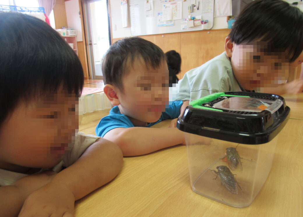 声は聞こえるけれど近くで見ることがなかなかできなかったのですが、「捕まえてきたよ~」とオレンジ組のお部屋に登場!早速、飼育ケースの周りに集まってきました。じっとしているセミをジーっと見つめる子どもたち。そうっと動き出すと、子どもたちの視線も動きます。ジジッと鳴くと嬉しさと驚きに友だち同士で目を合わせて、思いを共有していました。