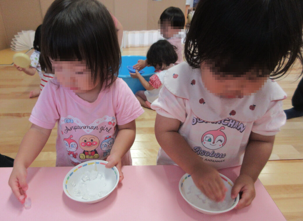 水遊びも楽しいけれど、お部屋で寒天を用意してみました。冷蔵庫で冷やしておいた寒天を見せると『これはなんだ?』と不思議そうな顔をして見ていたり、さわって確かめたり。中には頬にあてて冷たさを楽しむ子もいました。ぎゅっと握ると指の間からにゅるっと出てくる寒天の感触も面白くて、原型がなくなるまで集中して遊びこんでいました。