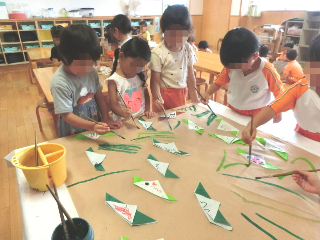 美味しく味わった後は、スイカを制作しました。みんなで協力して育てたので、制作も友だちと一緒に作ります。ひとりでは難しいことも、一緒に頑張れる友だちがいると、難しさも楽しさに代わるようです。