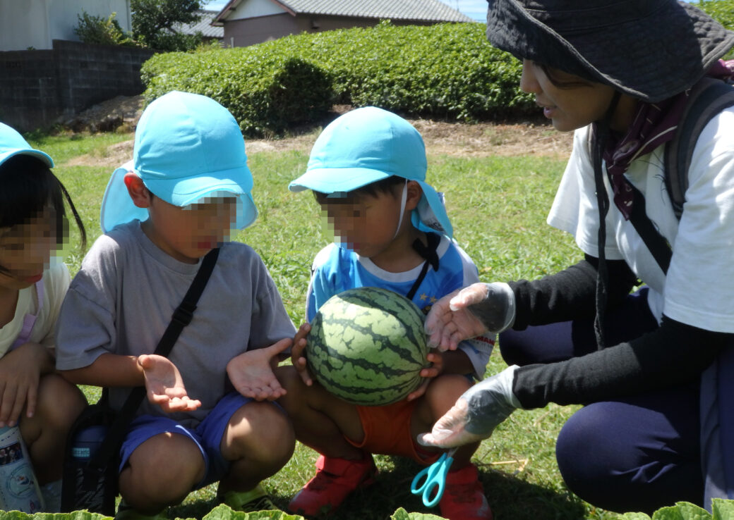 キュウリやナスとは違う生長の様子を見守りながら、一生懸命お世話をしていた子どもたち。収穫したスイカの肌触りや重さを感じて、その成果を実感しているようでした。